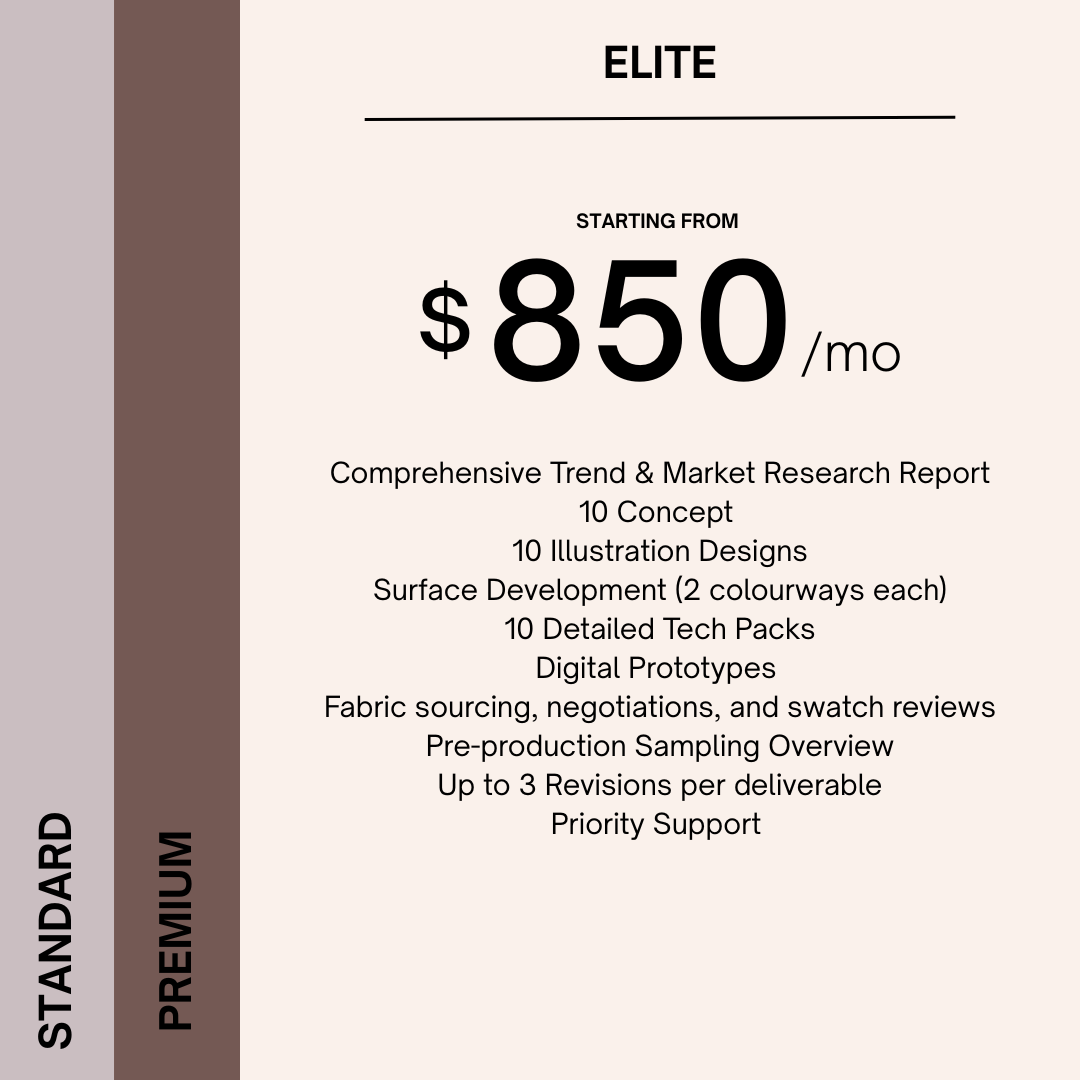 Starting your own clothing line is no simple task, but with the right planning and strategy, there are effective ways of bringing your product to market without breaking the bank. Work with us to uncover the viability of your line from start to finish. We’ll collaborate on the following areas so you are set up with a plan.
